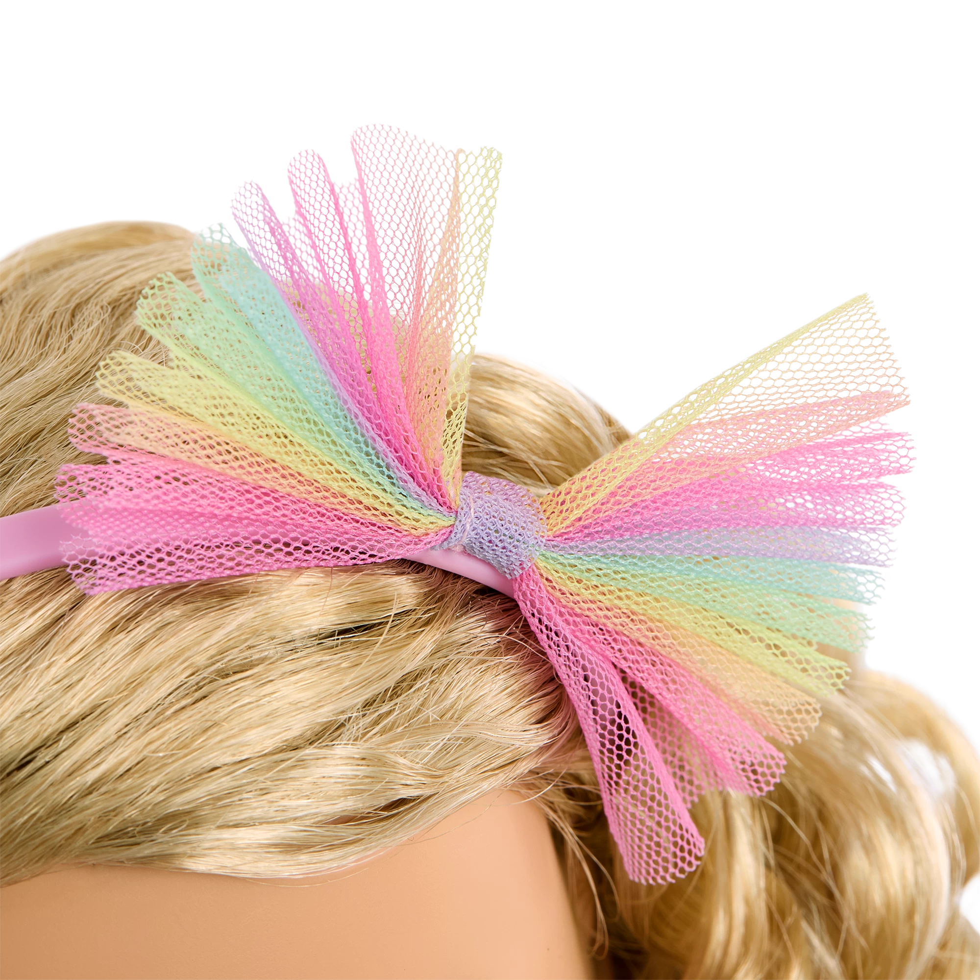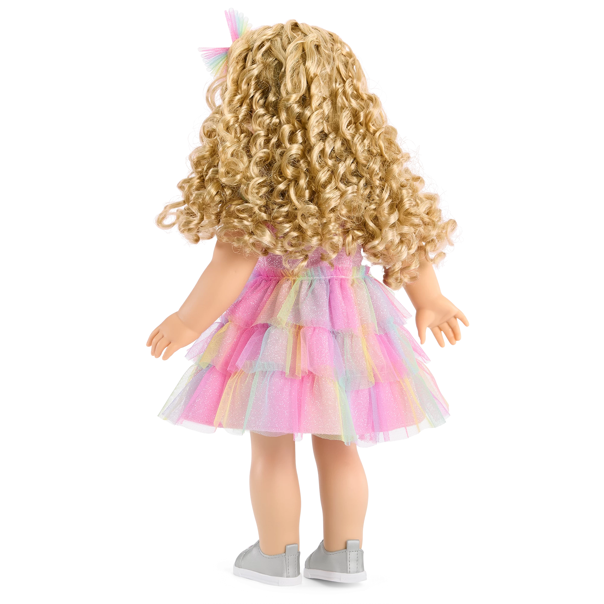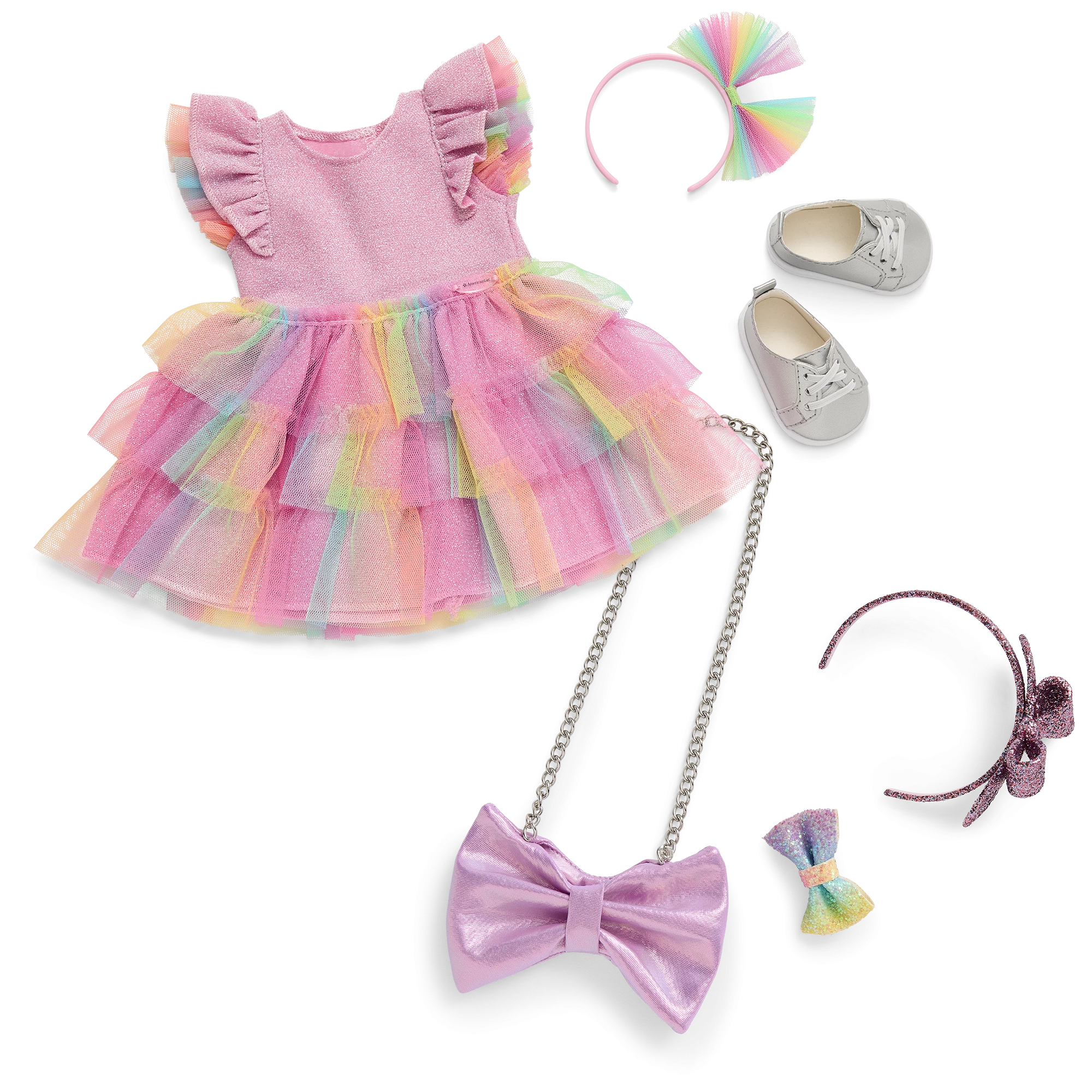 Pastel Party Dress for 18-inch Dolls: A pastel rainbow dress with a pink sparkle-knit bodice, ruffled sleeves, and a tiered rainbow mesh skirt, plus silver tennis shoes and a headband