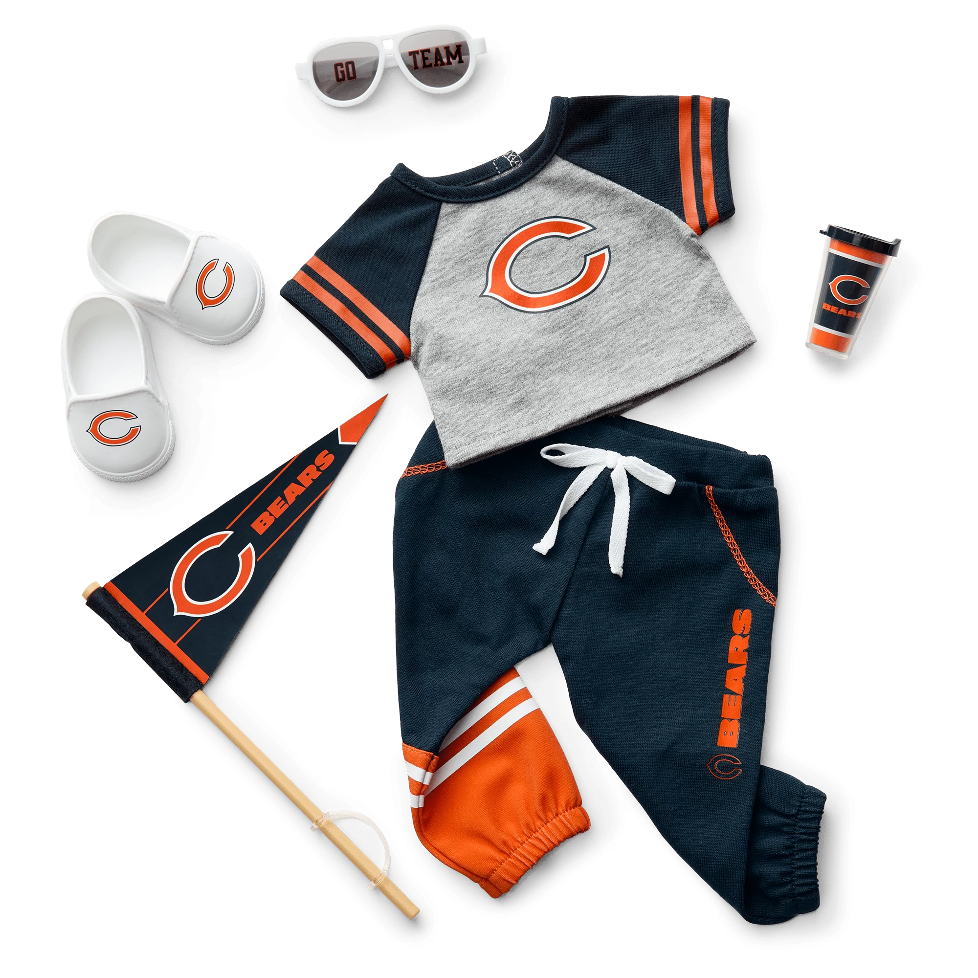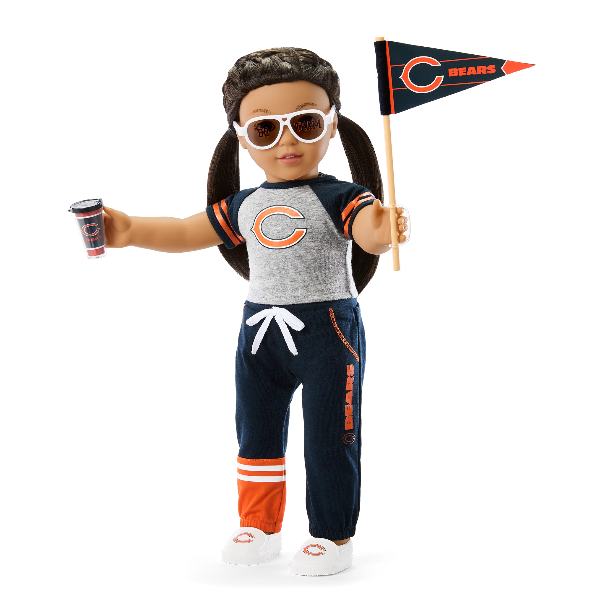 - A felt pennant with the team logo that dolls can hold, a pair of sunglasses with “Go Team!” written in the team colors on the lenses, and a team-logo tumbler that dolls can hold