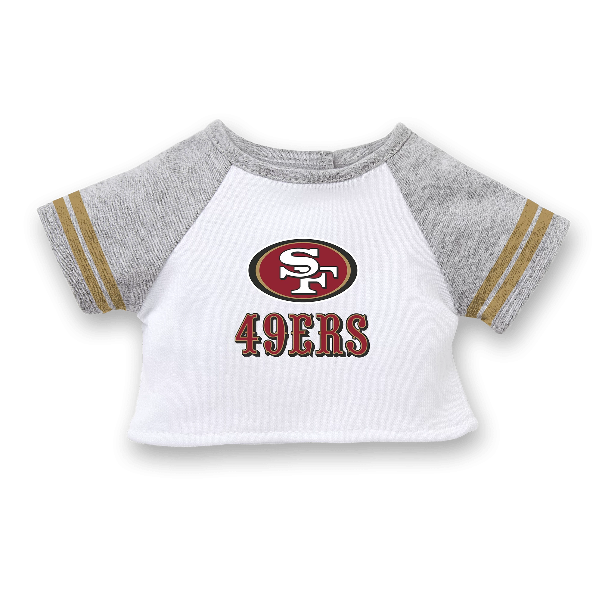 - A raglan-sleeved shirt with printed stripes at the sleeves and the official San Francisco 49ers logo on the chest