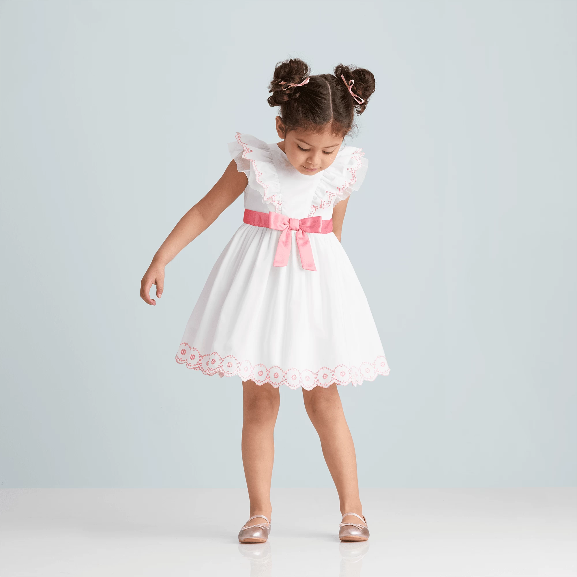 Your little one will be all set to celebrate in this pretty white party dress that matches her Bitty Baby doll’s. It has a full skirt, pink embroidery on the bodice and hem, and a satin bow at the waist. Cotton/polyester. Imported. White. Sizes 2T-6