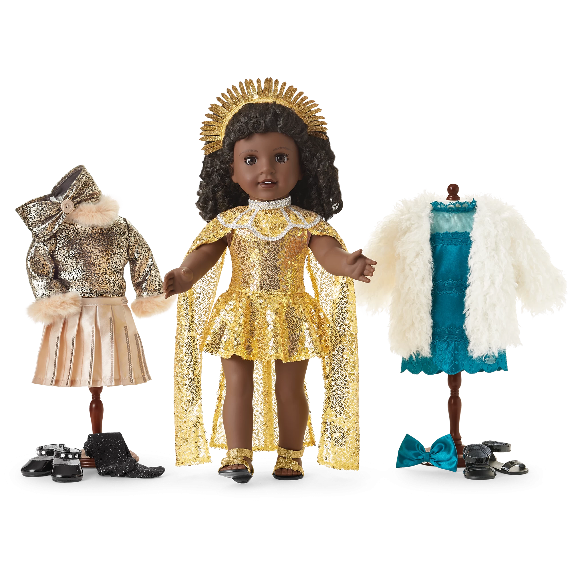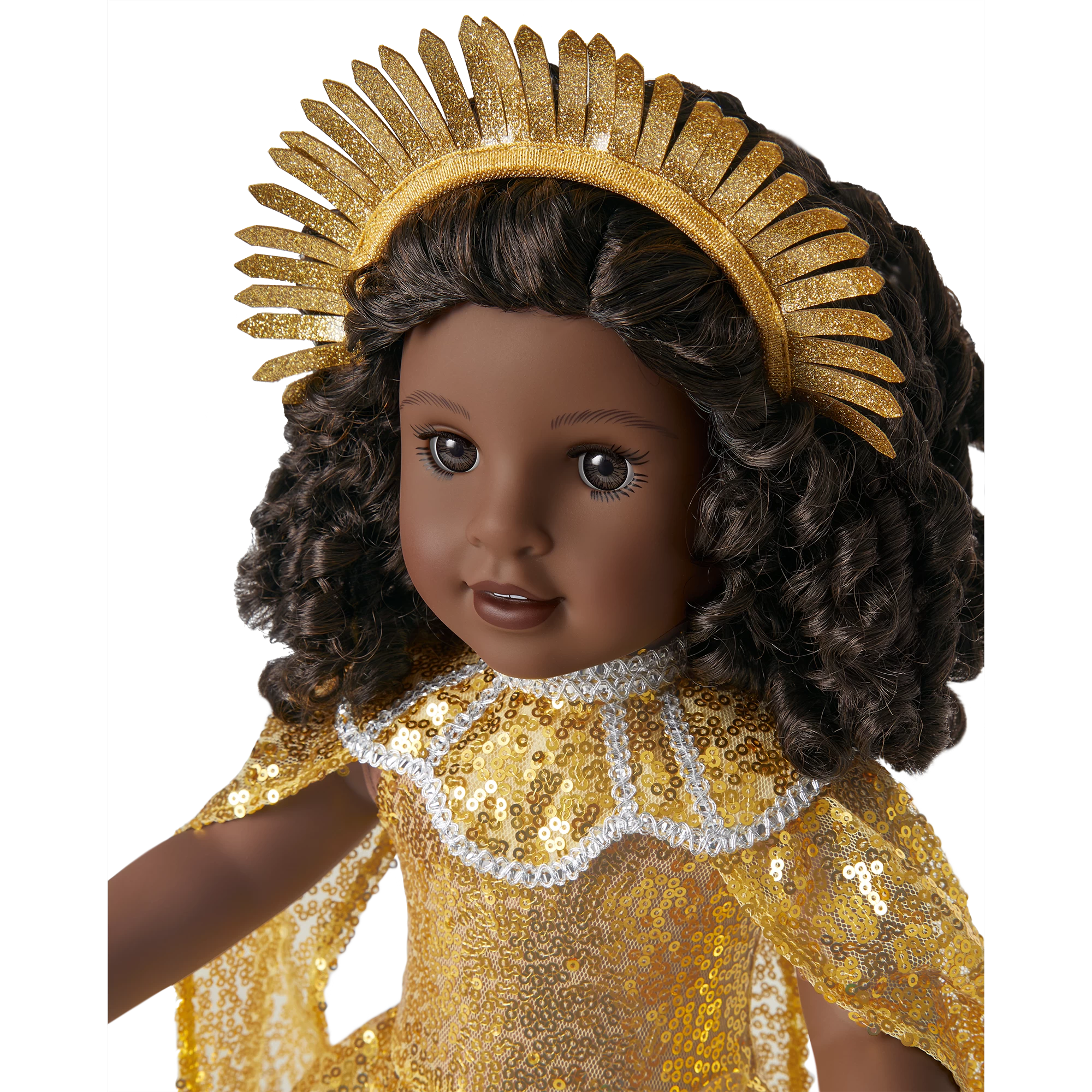 Glitzy Sequin Gown & Capelet Outfit for 18-inch Dolls: A gold glitter headpiece that frames her face, a dress entirely covered with gold sequins, golden sandals, and a high-neck capelet with gold sequins and contrasting silver trim