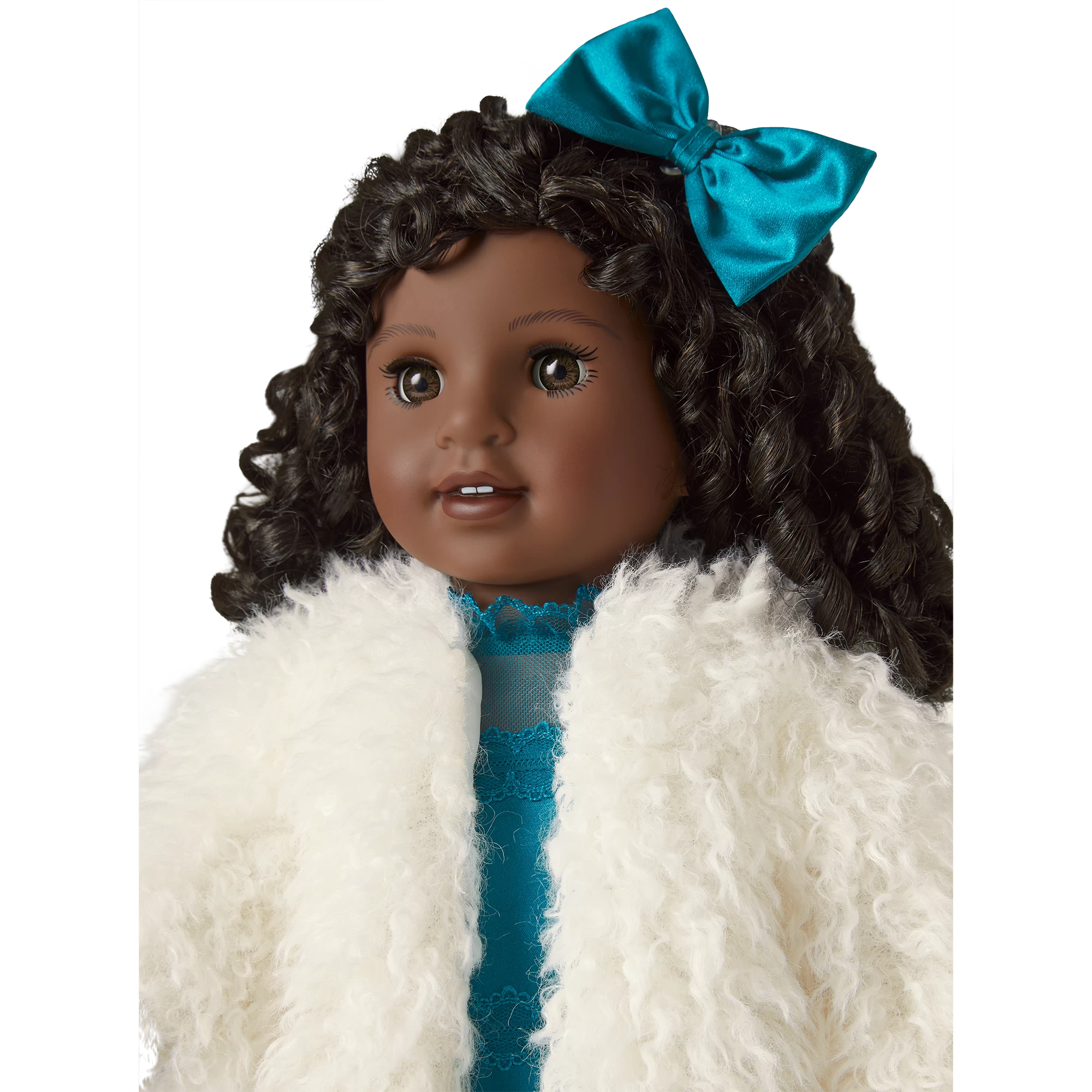 Jazzy Flapper & Fur Coat Outfit for 18-inch Dolls: A blue satin dress with a high neck and lace accents, plus a curly faux-fur coat, a satin hairbow, and shiny black shoes with low heels
