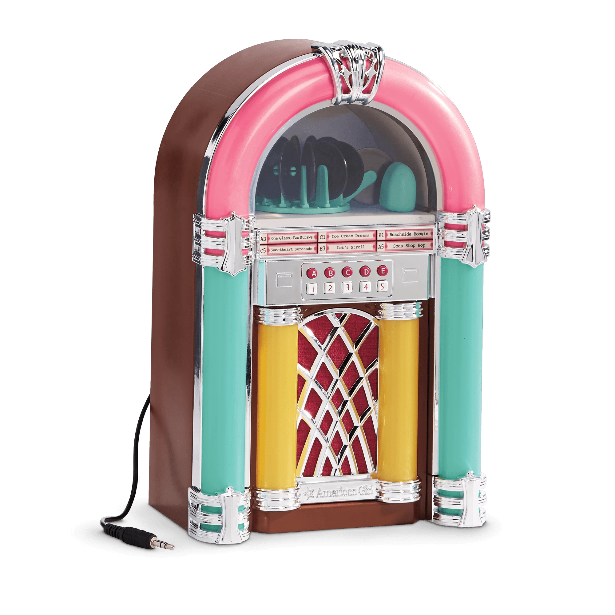 Rock and roll! In Maryellen’s day, jukeboxes were often found in restaurants and diners. People would scroll through a list of songs, then put in a few coins to play their favorites. This jukebox lights up and plays six pre-recorded ’50s-style songs when the buttons are pushed. Plus, girls can connect their own electronic music players to play all their favorite songs! Includes a 3.5 mm audio cable.