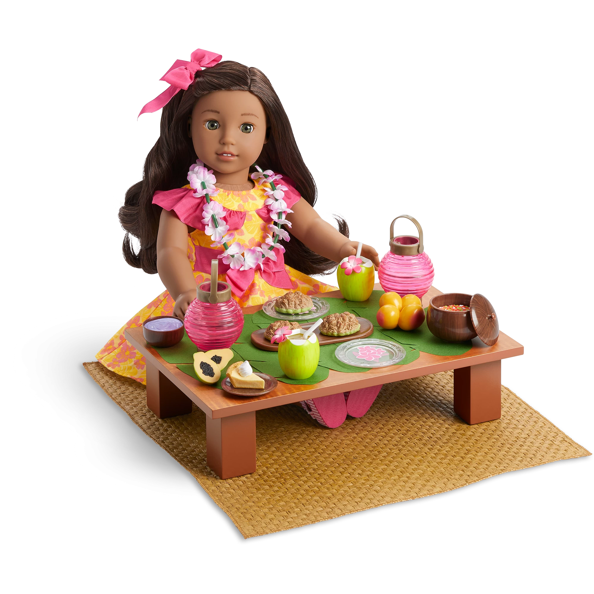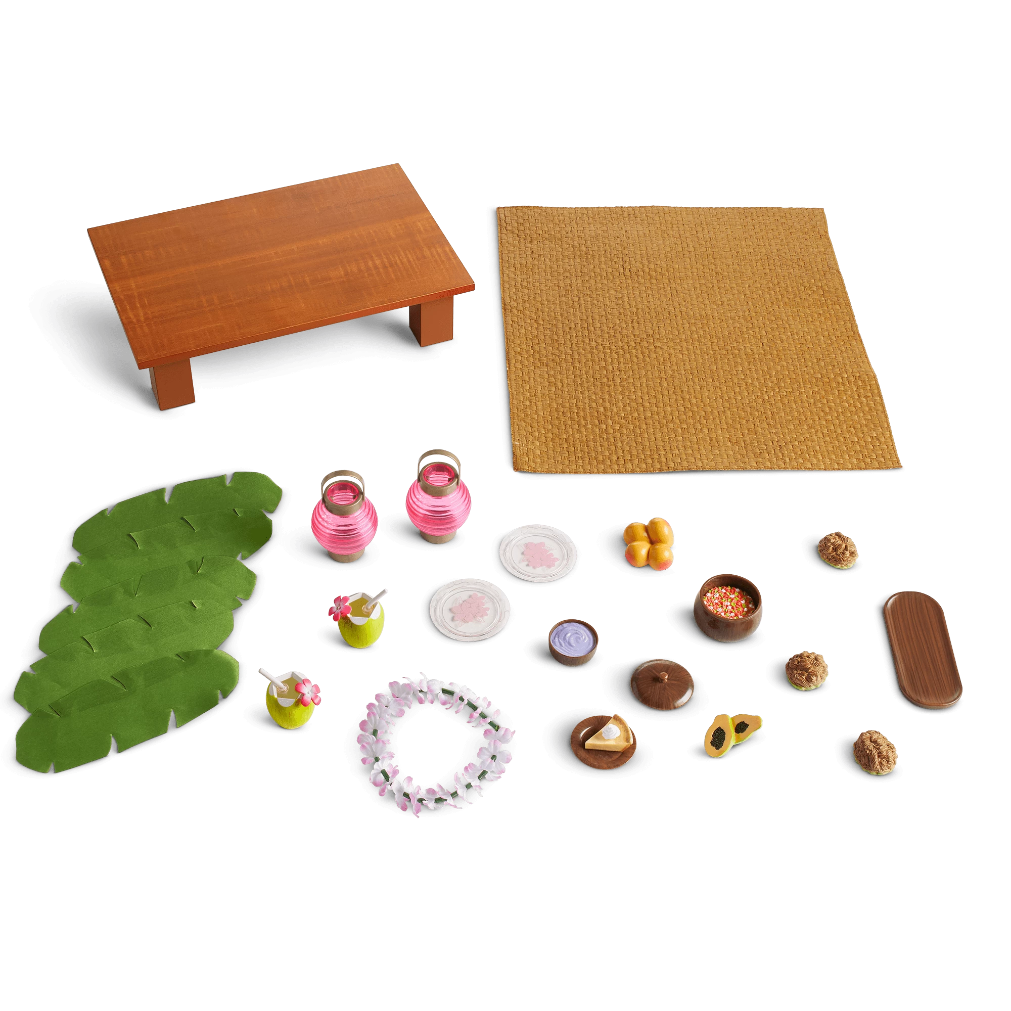 Nanea’s™ Luau Set: A low wooden table, festive pretend foods including kalua meat and a bowl of poi, table décor, and two red lanterns to hang for decorations.