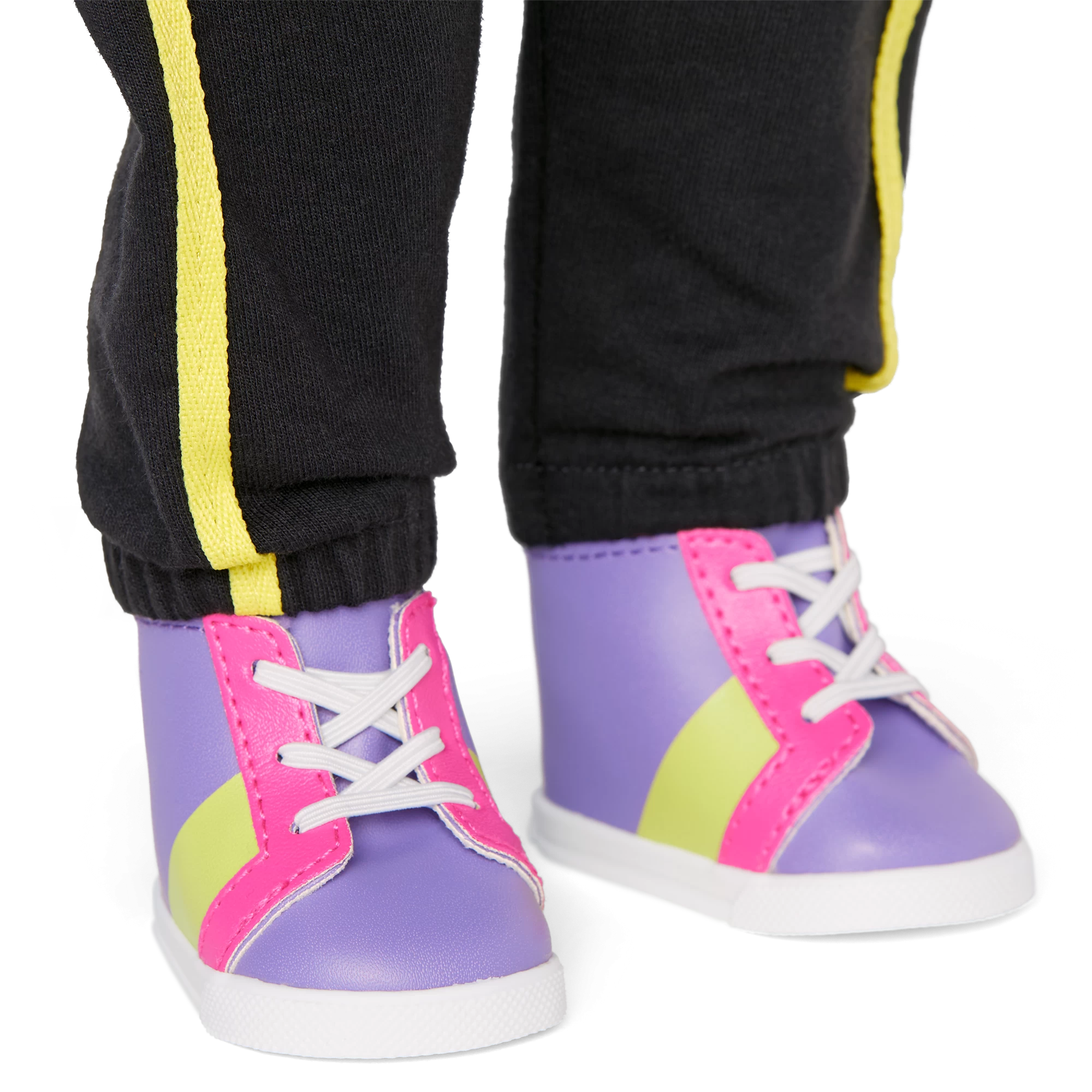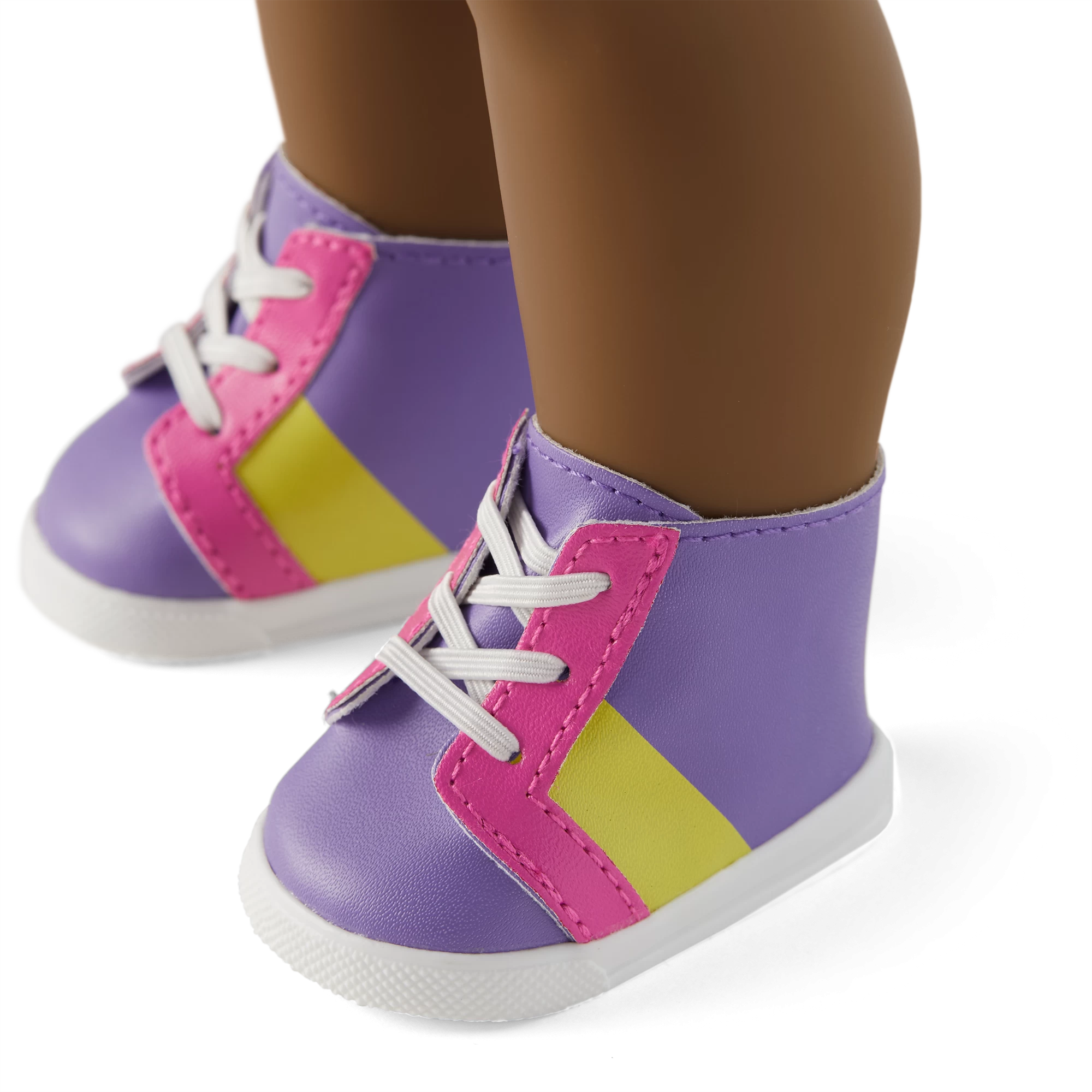 Show Your Sporty Side Outfit for 18-inch Dolls: A light purple T-shirt dress with rainbow striped trim that’s printed with an “AG Active” graphic and a pair of sneakers with stripe details