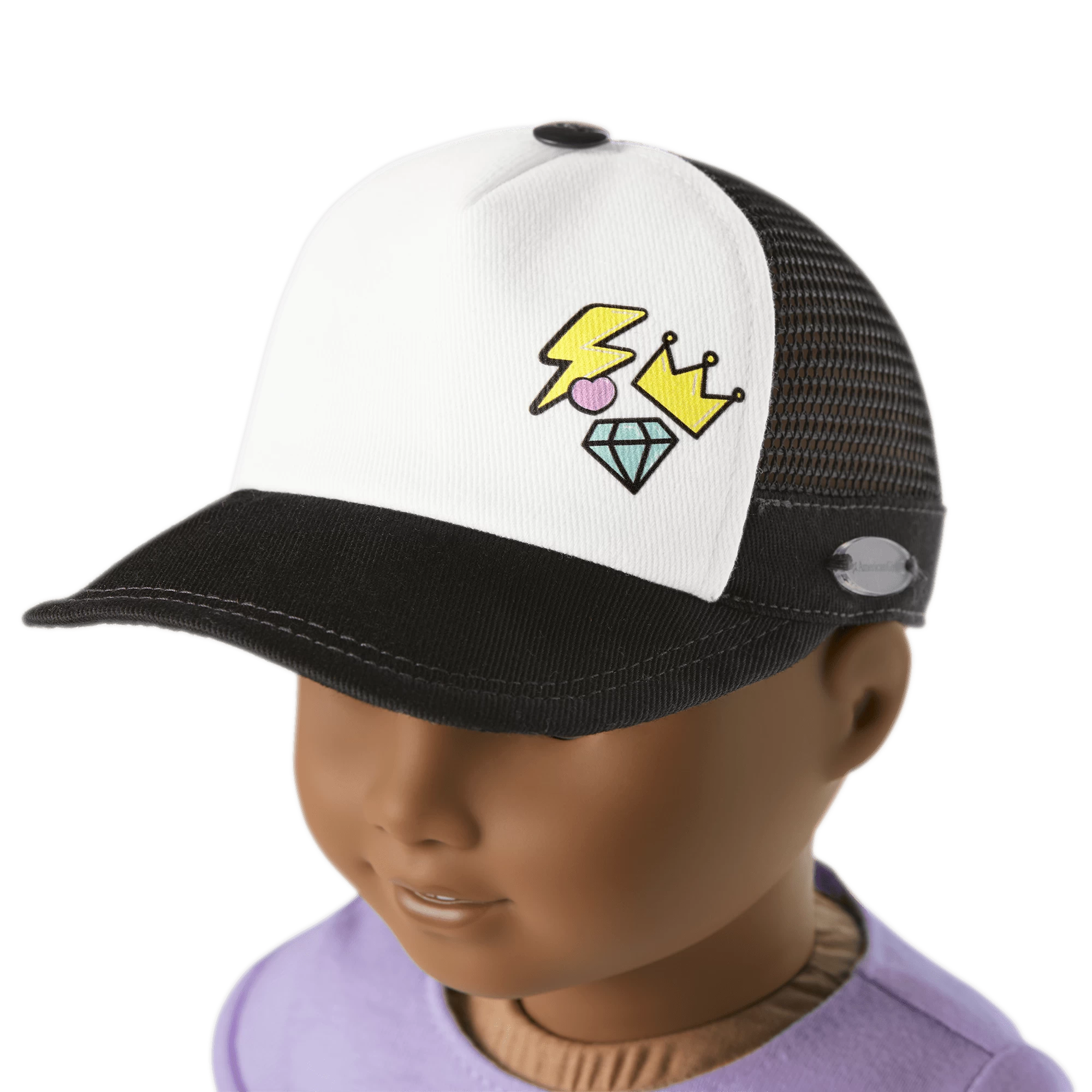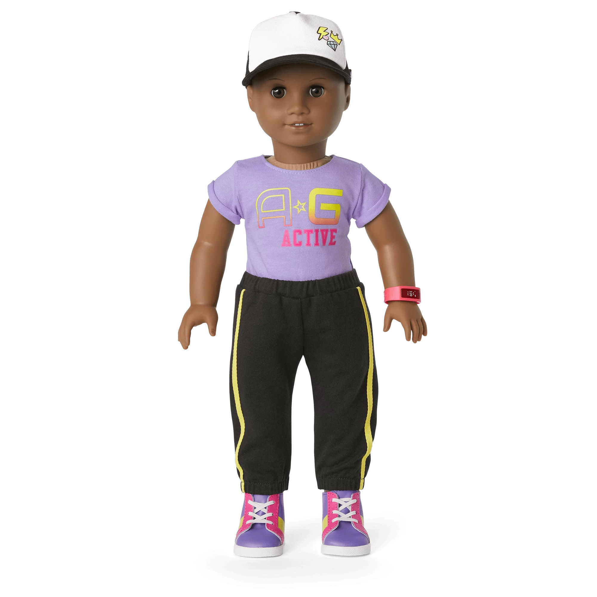 Show Your Sporty Side Accessories for 18-inch Dolls: A pair of black joggers with yellow twill tape stripes, a baseball cap with crown and gem graphics, and a faux fitness-style watch