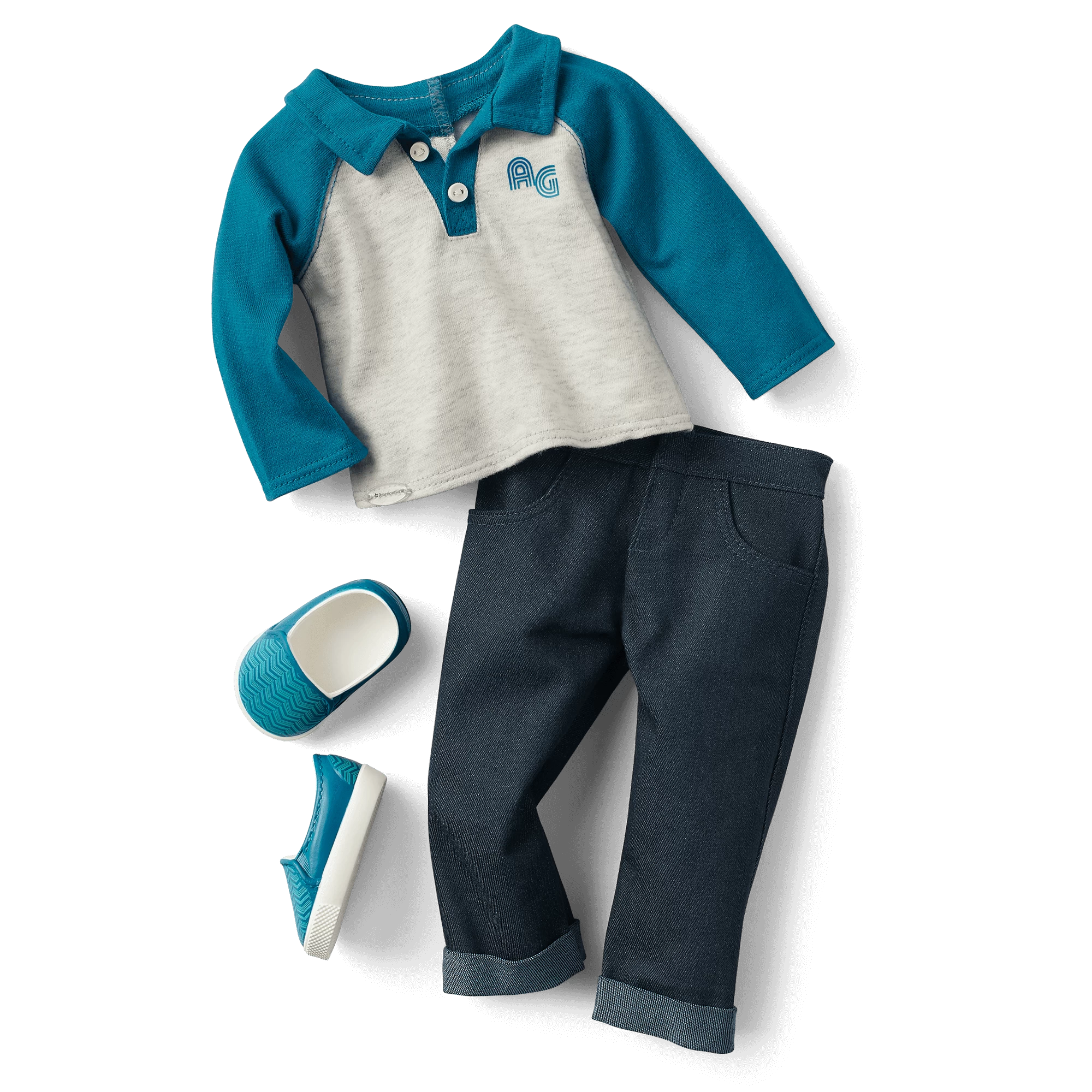 - A heathered-gray collared shirt with contrasting blue sleeves and an AG logo on the chest