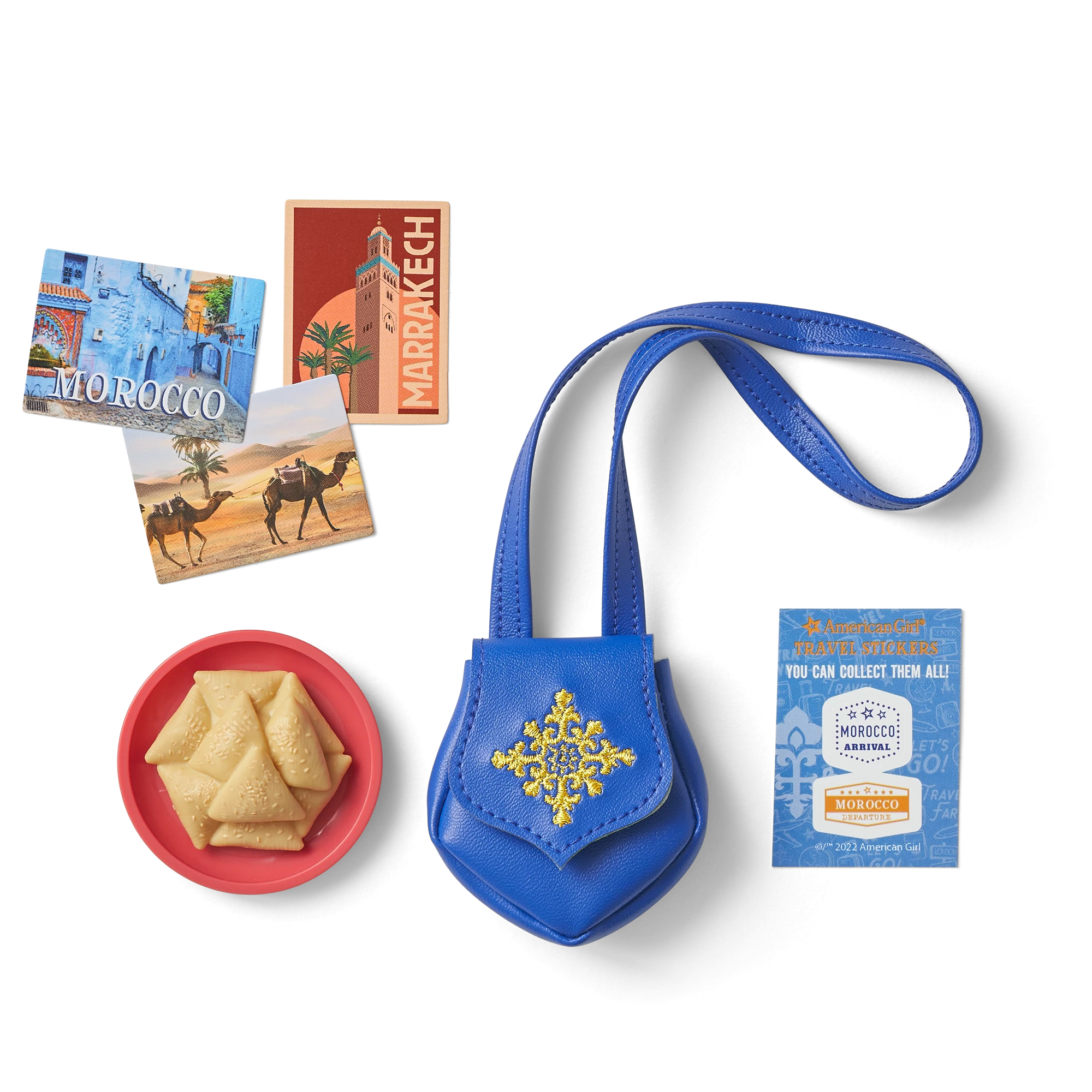 Moroccan Souvenir Set: An embroidered purse, a pretend almond pastry on a plate, three Moroccan postcards, and a sheet of travel stickers