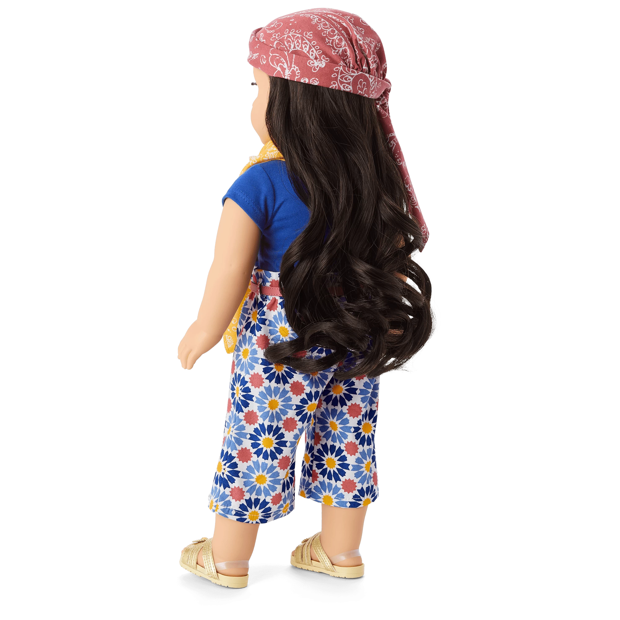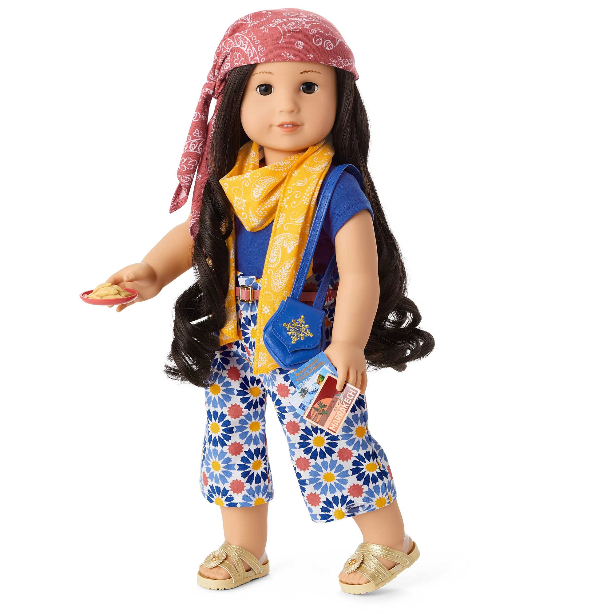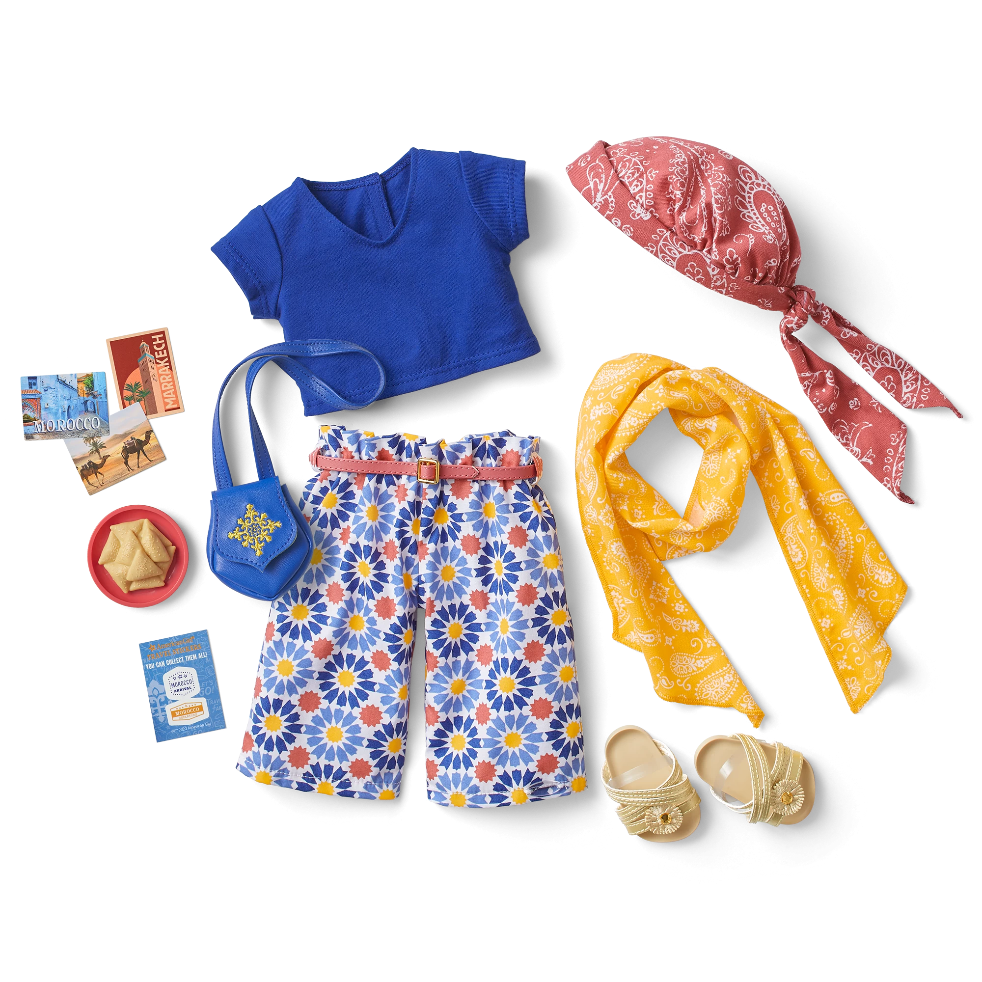 Dolls can explore the northern coast of Africa with a set inspired by colorful tile motifs and the blue of the Mediterranean Sea. Includes: