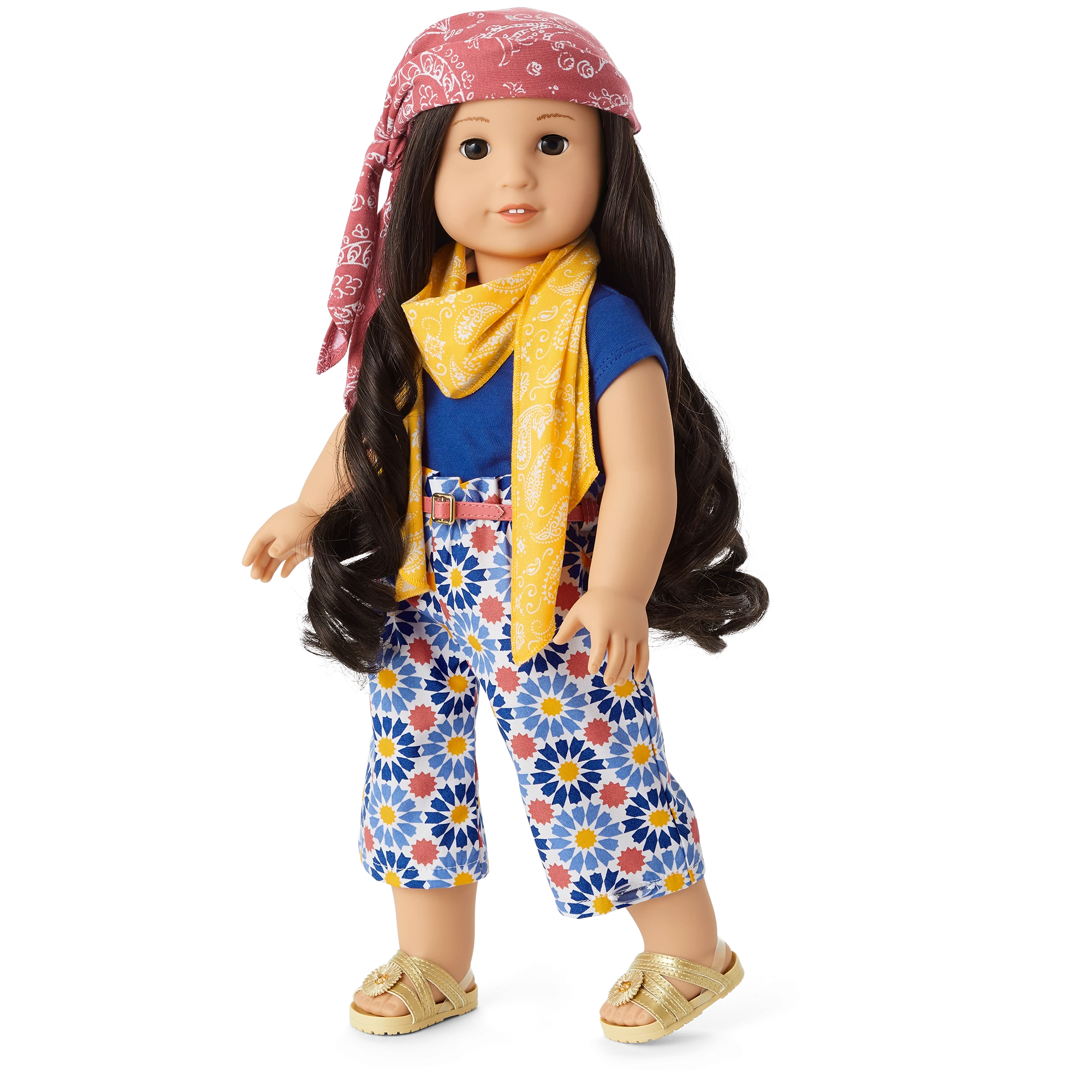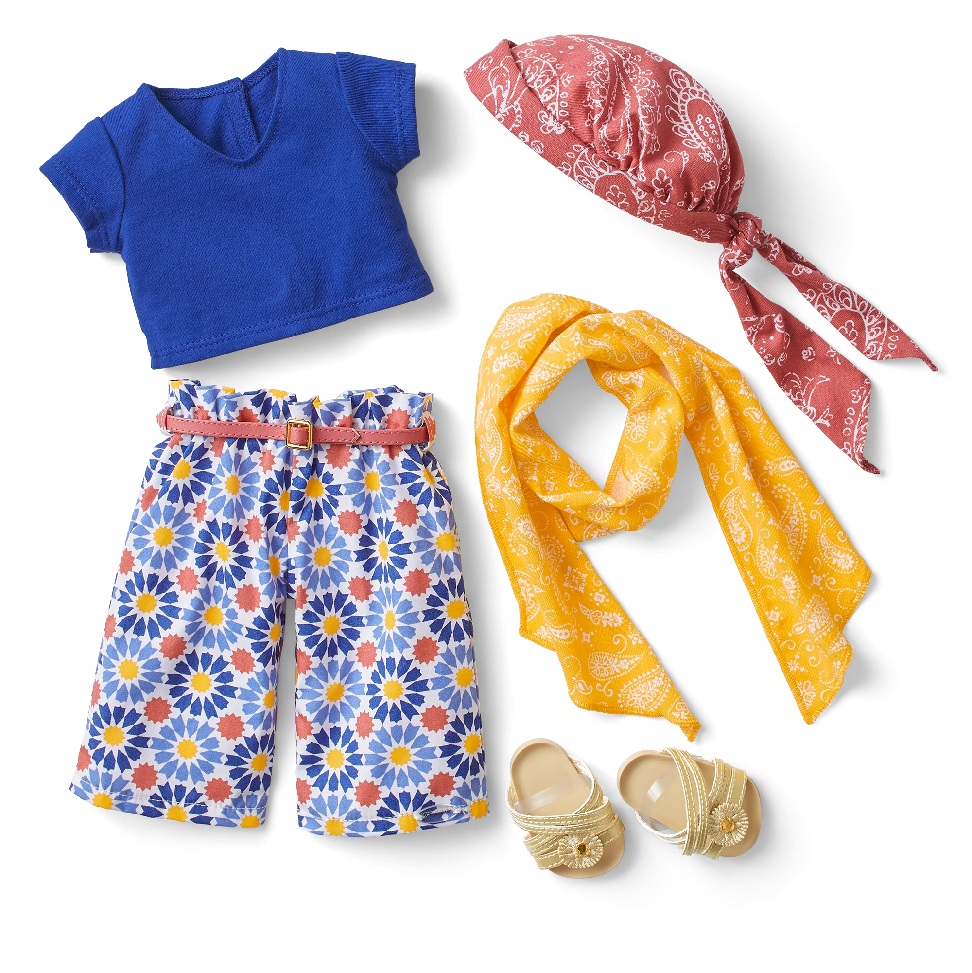 World Traveler in Morocco Outfit: A blue knit tee, a pair of wide-leg print pants, strappy sandals, a headscarf, a neck scarf, and a belt